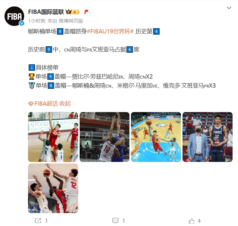 FIBA官方今日晒出数据,郇斯楠单场8记盖帽是U19世界杯单场历史第二多,比肩文班,仅次周琦。